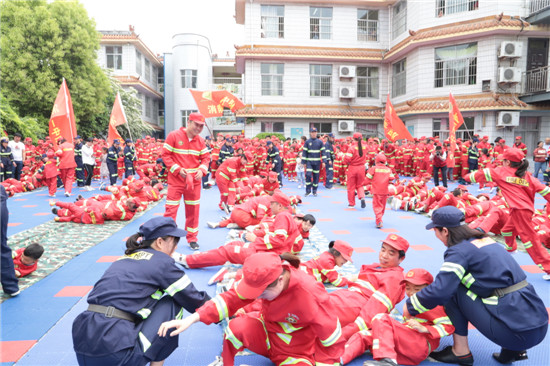 記者在現(xiàn)場(chǎng)看到,數(shù)十名老師分工明確,變身為“消防教官”;千名孩子隊(duì)列整齊,成為“小小消防員”;家長(zhǎng)則相伴左右,擔(dān)任“大大消防員”的角色。演練從“火災(zāi)”現(xiàn)場(chǎng)撤離拉開(kāi)序幕,消防健身體操、火場(chǎng)逃生、攀爬通過(guò)軟橋、打滾自救、滅火實(shí)驗(yàn),還有催人淚下的兒童防走失演練“小蝌蚪找媽媽”。“小蝌蚪找媽媽”活動(dòng)是讓孩子們無(wú)人引導(dǎo)的情況下,在所有家長(zhǎng)穿著相同、戴著帽子、戴著眼罩的茫茫人海中找爸爸媽媽。