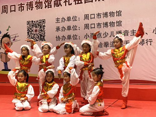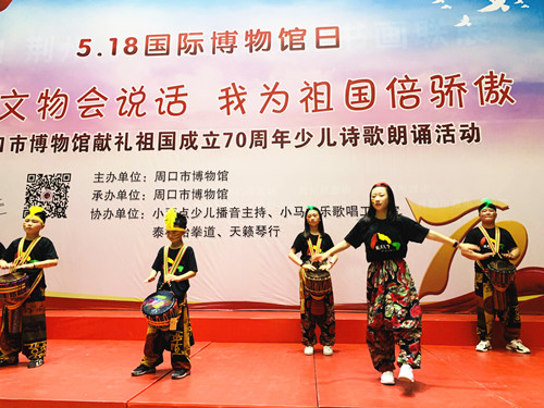 5月18日國際博物館日當天,周口市博物館舉行系列主題活動“如果文物會說話,我為祖國倍驕傲”詩歌朗誦活動、文物繪畫作品展活動。在活動現(xiàn)場,小朋友們帶來了精彩紛呈的節(jié)目,有根據(jù)市博物館的文物創(chuàng)作的詩歌作品《文物會說話:漢代玉豬》《文物會說話:戰(zhàn)國青龍玉佩》,有集體朗誦《中華頌》《初生的太陽》《我驕傲我是中國人》,還有獨唱、舞蹈、相聲、跆拳道、非洲鼓表演等,共同為本次活動增光添彩。