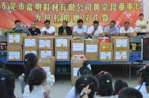 當(dāng)日下午,廣東東莞富明鞋材有限公司董事長黃宗昆為母校薛廟小學(xué)師生捐贈(zèng)愛心運(yùn)動(dòng)鞋儀式在馬頭鎮(zhèn)薛廟小學(xué)舉行。馬頭鎮(zhèn)中心校副校長李永長、中心校辦公室主任章紅勝、薛廟行政村黨支部書記黃志華等村兩委領(lǐng)導(dǎo)、校長黃景思、名譽(yù)校長孫道紅、全校260 多名師生及部分學(xué)生家長600多人參加了當(dāng)天的捐贈(zèng)儀式。