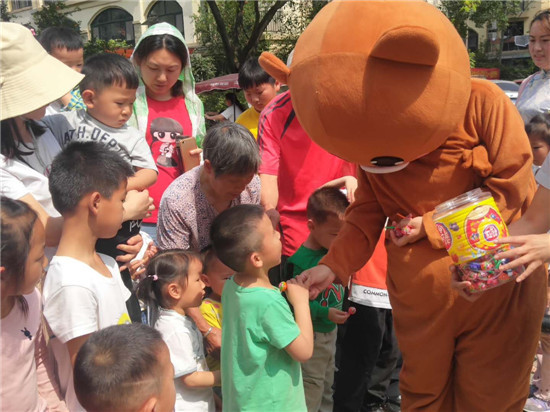 活動(dòng)中,工作人員精心穿著卡通人偶服裝與小朋友們熱情互動(dòng)、做游戲,天氣雖然炎熱,但孩子們卻忙的不亦樂乎,家長(zhǎng)們喜笑顏開,一派祥和、歡樂的氣氛。
