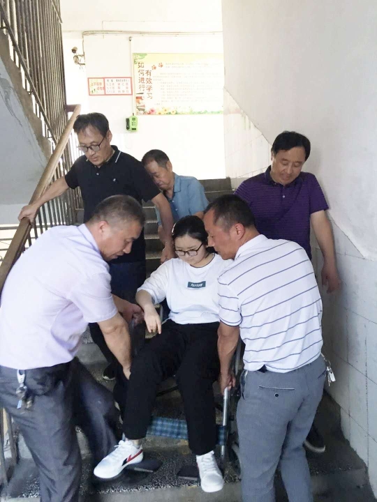 “考慮到她行動不便,我們適當?shù)卣{(diào)整了桌子之間的距離?!绷_明中表示,兩天來,晉淼在實驗中學考點服務工作人員的幫助下,從一樓抬進三樓考場。每場考場結(jié)束后,考點工作人員又把她從三樓抬下來,推到家長身邊。