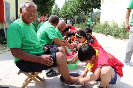 7月的太康,酷熱難耐。6日上午8時許,一輛公交車穩(wěn)穩(wěn)??吭谔悼h芝麻鄉(xiāng)敬老院門口,車上下來20多名身穿紅馬甲的學(xué)生志愿者,他們抬著米、面、油和雞蛋等物品走進(jìn)敬老院。坐在門口等候的老人們,樂呵呵地上前迎接客人。整個敬老院一下子熱鬧起來。放下物品,孩子們立馬開始勞動,他們從老人們宿舍搬出馬扎、板凳,在院中擺放安穩(wěn),扶著老人坐上去,開始給老人洗腳。正上初中一年級的李博泉細(xì)心地幫72歲的張照志老人摳掉趾甲縫和腳底的污垢。張老漢流淚了:“這輩子有人給我洗腳,我真是不知道哪修來的福氣……”