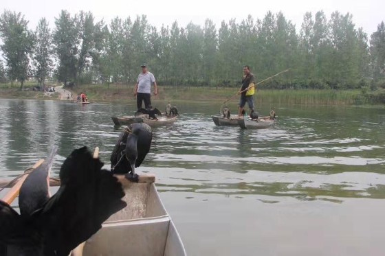 悄悄地,漁船輕移,飄至河心。船家一聲令下,鸕鶿箭一般竄入河中,或撲棱翅膀,搏擊水面,或緊追游魚,銜進(jìn)口中。采風(fēng)團成員,緊盯鸕鶿銜魚,快按鏡頭,收獲一張張豐收畫面。
