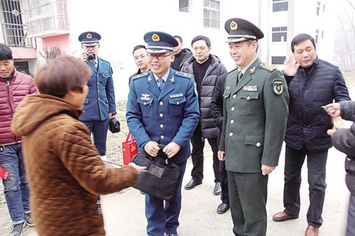 項(xiàng)城市人武部政委汪燦輝為立功受獎(jiǎng)戰(zhàn)士家庭送喜報(bào)