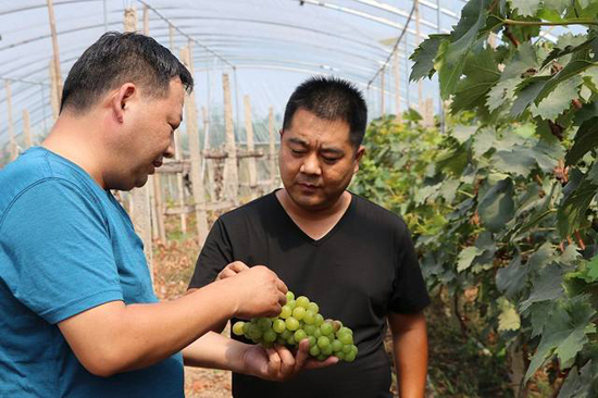 聽說位口村村主任孫東獻的專業(yè)種植合作社里,種了15畝的葡萄,每年給30戶貧困戶分紅上萬元。葡萄種植、施肥、除草等日常管理給貧困戶提供工作機會,每人每天能收入40多元。筆者帶著好奇,走進了孫東獻家的葡萄園。