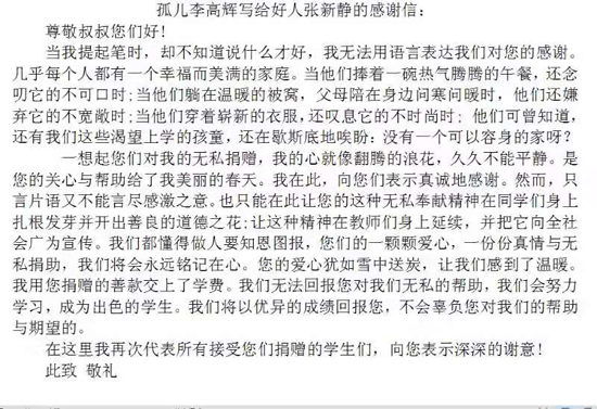 為表示對張新靜等人大代表的感謝,隨后,李高輝給張新靜寫了一封感謝信。信中,他表示,自己一定不辜負(fù)大家的期望,以后會更加努力學(xué)習(xí),回饋社會,回報(bào)大家?!八且粋€(gè)懂得感恩的孩子,讀了他的來信,我感到很欣慰。”張新靜說。