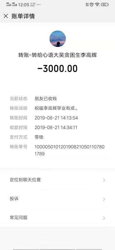 “今后,在學(xué)習(xí)和生活上無論遇到什么困難,只管給我們說,我們會隨時(shí)幫助你解決?!睆埿蚂o在與李高輝聊天中再三叮囑李高輝說。隨后,他通過微信給李高輝轉(zhuǎn)來3000元學(xué)費(fèi)。