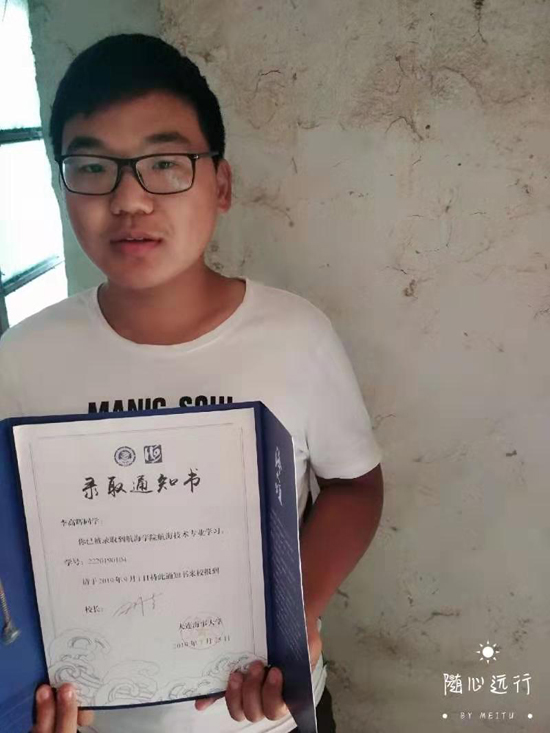 據(jù)了解,李高輝是一個(gè)命苦的孩子,很小的時(shí)候父親因病去世,母親改嫁,無奈,他只好跟隨年邁多病的爺爺奶奶一起生活,家庭十分拮據(jù)。俗話說,窮人的孩子早當(dāng)家。李高輝從小學(xué)就知道勤奮學(xué)習(xí),養(yǎng)成了不懼困難,愛幫助別人的性格,深受師生喜愛。經(jīng)過10多年努力拼搏,2019年高考,他以優(yōu)異的成績被大連海事大學(xué)航空學(xué)院錄取。
