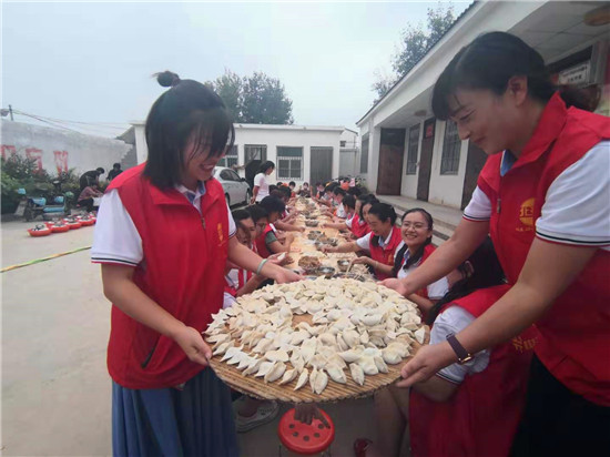 與此同時(shí),在演出現(xiàn)場(chǎng)附近的村委大院內(nèi),由周口市慈孝文化促進(jìn)會(huì)、北斗達(dá)教育集團(tuán)等組成的200多名志愿團(tuán)隊(duì)正忙得不亦樂(lè)乎,調(diào)餡、包餃子、下鍋、端盤(pán),兩個(gè)多小時(shí)內(nèi),他們精心包出20000多個(gè)愛(ài)心水餃。11時(shí)30分,餃子宴正式開(kāi)始,老人們一邊吃著水餃一邊觀看者演出,喜笑顏開(kāi),呈現(xiàn)出一片相親相敬的溫馨畫(huà)面。