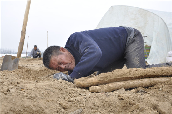 11月26日,沈丘縣白集鎮(zhèn)40多歲的耿金中與另外兩個同伴一起來到周口城鄉(xiāng)一體化示范區(qū)許灣鄉(xiāng)肖王莊,未來的一段時間,他們吃住都將在這里進行,直到將這一區(qū)域的山藥挖完。耿金中說,他挖山藥已經(jīng)有20多年了,20多年前,沈丘縣大規(guī)模種植山藥,每到收獲時,會有很多山東挖山藥工人來這里挖山藥。他看到這個行當(dāng)能賺錢,就開始學(xué)挖山藥技術(shù)。此后的多年,他先后到山西、湖北、安徽等地挖山藥。