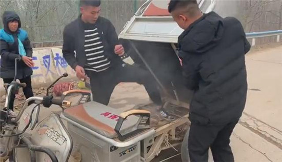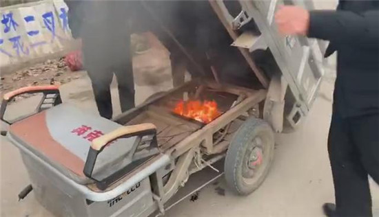 “當(dāng)時(shí)在我們前方的一輛電動(dòng)三輪車(chē)駕駛座下冒出黑煙,車(chē)上兩位老人察覺(jué)到危險(xiǎn)后,急忙下車(chē),站在一旁不知所措。我們也緊跟上前。事發(fā)突然,現(xiàn)場(chǎng)沒(méi)有滅火器和可利用水源,而三輪車(chē)的火越來(lái)越大,兩位老人著急萬(wàn)分,在旁邊不停地請(qǐng)求我們幫幫她們。根據(jù)經(jīng)驗(yàn),我們當(dāng)機(jī)立斷利用路邊的泥土進(jìn)行撲救,經(jīng)過(guò)幾十秒的緊張撲救,著火部位被成功撲滅。”三位消防隊(duì)員回憶說(shuō)三輪車(chē)是電線短路引起的電瓶著火。