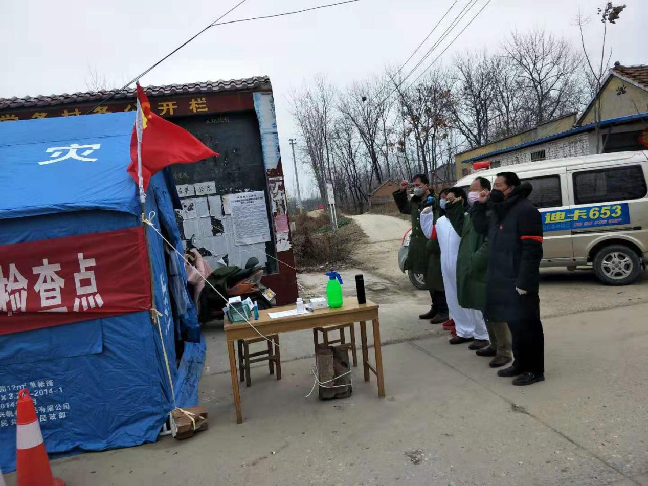 “我莊嚴(yán)宣誓,為維護(hù)人民群眾身體健康及生命安全,全力做好新型冠狀病毒感染的肺炎疫情防控工作,誓死捍衛(wèi)新時(shí)代黨員干部的使命與擔(dān)當(dāng)?!边@是付集鎮(zhèn)黨委副書記曹懷永帶領(lǐng)張埝卡點(diǎn)宣誓的場(chǎng)景。2月5日,這段感人而又讓人充滿信心的宣誓聲,在付集大地相繼響起,張埝卡點(diǎn)一線臨時(shí)黨支部正式成立。