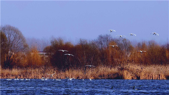 2月21日,50多只白天鵝在國家濕地公園淮陽龍湖自由游弋、展翅翱翔的美麗畫面被記者一一收入鏡頭。記者現(xiàn)場看到,初春的龍湖,天藍水碧,萬物萌動。這群白天鵝的到來,使萬畝龍湖一下子變得靈動起來。它們有的在水面上自由覓食,一副悠然自得的神態(tài);有的時而煽動翅膀,抖落長途跋涉的疲憊;有的飛向藍天,盡情享受著春日暖陽。為了不打擾這群“客人”,又能拍攝到相對清晰的圖片,記者環(huán)繞龍湖多處踩點,用200mm鏡頭+2倍增距鏡,蹲守一天,最終在畫卦臺前湖岸向東南方向遠距離拍攝到了這些美麗的畫面。