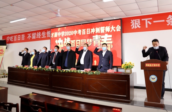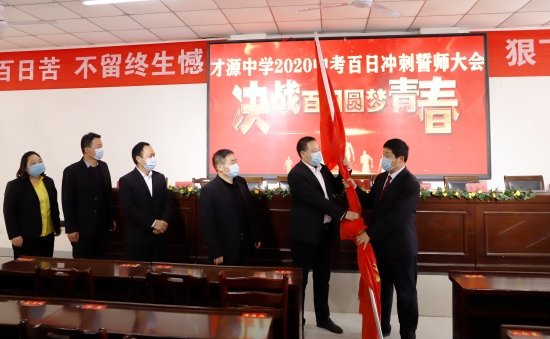 誓師大會現(xiàn)場,才源中學(xué)校長張醒民向九年級階段負(fù)責(zé)人授戰(zhàn)旗。師生代表面對直播鏡頭向全體初三師生發(fā)出鏗鏘誓言,號召大家奮勇爭雄,2020年再奪中考全市領(lǐng)先的佳績。誓詞為:凌志擎天,豪氣滿懷;天道酬勤,樂戰(zhàn)不?。灰鈭孕暮?,信念常在;以我雄心,征戰(zhàn)未來;沖刺百日,只為無悔青春;人生綻放,定是風(fēng)雨兼程;今日苦讀書厲兵秣馬,明朝進重點吐氣揚眉。