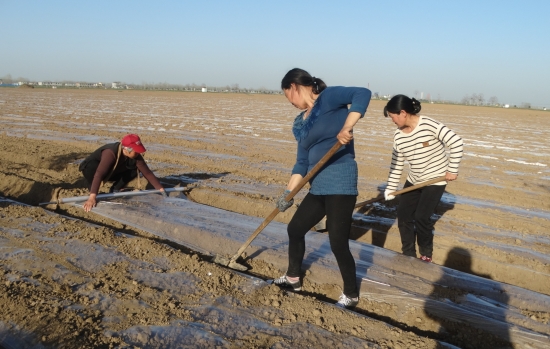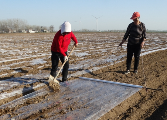 3月24日,沈丘縣周營(yíng)鎮(zhèn)歐營(yíng)村生態(tài)中藥材種植基地,當(dāng)?shù)亍八庌r(nóng)”們正為新種植的白術(shù),覆蓋農(nóng)膜增溫保墑。