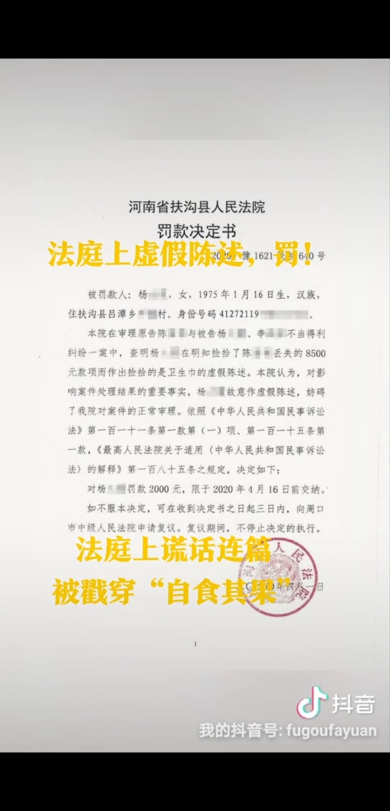 為了將撿到的8500元錢據為己有,當事人竟然在法庭上作出虛假陳述,最終不僅被法官當庭識破,全額返還失主,還被法院處以2000元罰款,真可謂得不償失、自食苦果。近日,針對被告楊某的虛假陳述行為,扶溝縣人民法院呂潭法庭依法作出罰款2000元的處罰決定,楊某在規(guī)定時間內繳清了罰款。