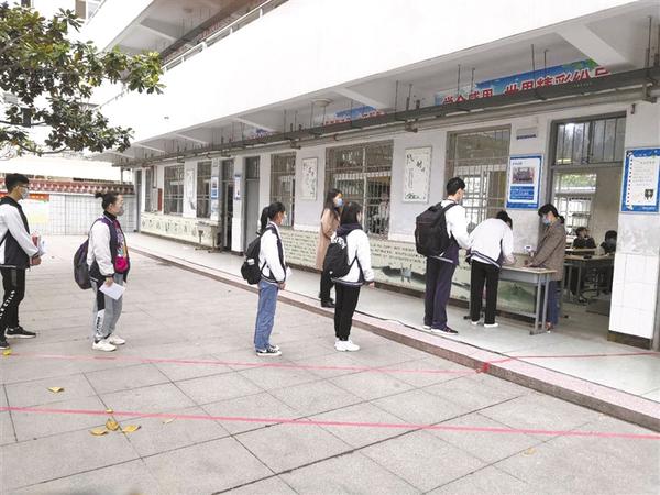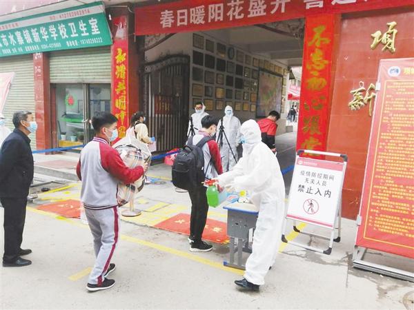 4月20日6時50分,記者在周口四中門口看到,學(xué)生們在家長的陪伴下陸續(xù)趕來,按照學(xué)校提前下發(fā)的入校流程,在校門口間隔一米距離有序排隊。然后,他們按規(guī)定依次遞交健康承諾表后,在值班教師的引導(dǎo)下,通過大門兩側(cè)設(shè)置的體溫測試通道入校,每個通道處都有工作人員負(fù)責(zé)引導(dǎo)學(xué)生、噴灑消毒液。