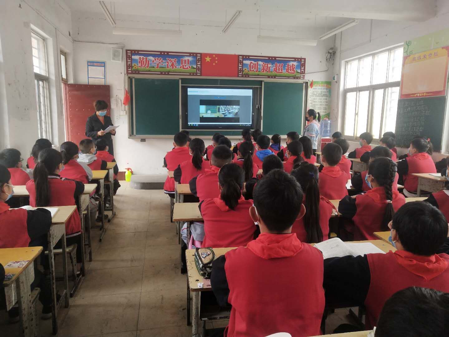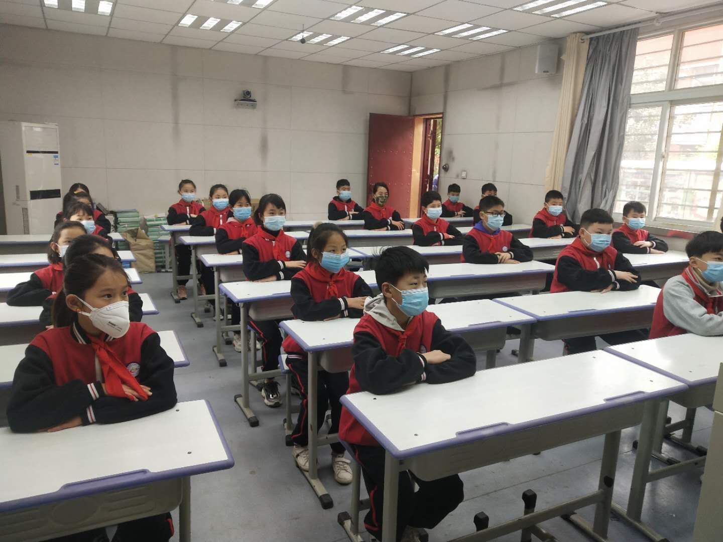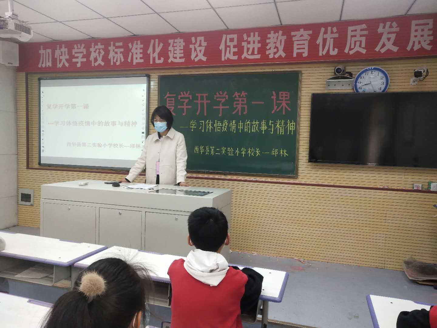 該校校長邱林為全校4、5、6年級1千多名師生上復學第一課,重點講述疫情之中感動 、疫情帶給我們的啟示。