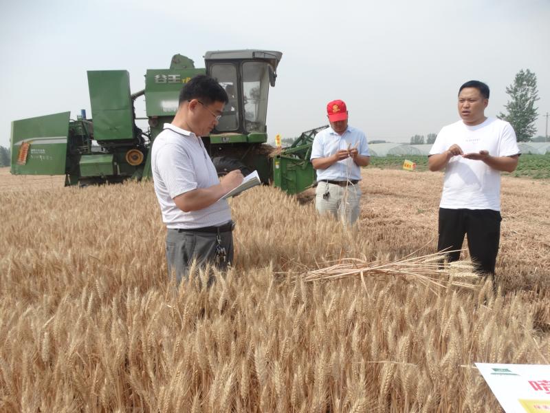 上午9點,專家組首先來到石槽集鎮(zhèn)虎頭村一塊小麥產(chǎn)示范田基地?!澳魄?,俺這麥長得多好,遍地金黃,麥穗稠滿,穗頭勻稱,籽粒飽滿。”村民王天齊興奮地告訴筆者?!斑@塊地實際面積為2.3畝,種植的是百農(nóng)307新品種,估摸著超1300斤沒問題!”王天齊信心滿滿。隨后,縣農(nóng)業(yè)專家組吳和平等一行參照農(nóng)業(yè)農(nóng)村部小麥高產(chǎn)創(chuàng)建產(chǎn)量測產(chǎn)驗收辦法,經(jīng)過嚴格的面積丈量核實、機械收獲脫粒、稱量、扣除水分和雜質(zhì)后,實際畝產(chǎn)達1442.6斤,從而刷新了全縣2020年小麥小面積高產(chǎn)攻關(guān)最高紀錄。