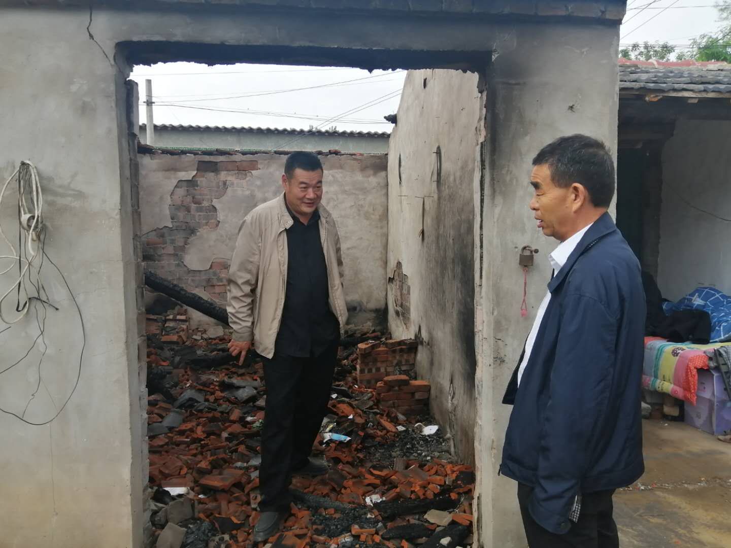 聽完情況后,督導(dǎo)組立刻和駐村工作人員一起到李洪范家查看情況,現(xiàn)場主屋已經(jīng)全部燒毀,屋里到處是瓦礫......李洪范站在被燒毀的房屋里,表情木納的自言自語道“燒得一干二凈,什么都沒了,這以后咋弄呀?!爆F(xiàn)場詢問其生活情況時(shí),李洪范說,“當(dāng)天,鄉(xiāng)里邊就送來了米、油和錢。村長也送來了幾件衣服,現(xiàn)在就是沒有地方住?!?/p>
