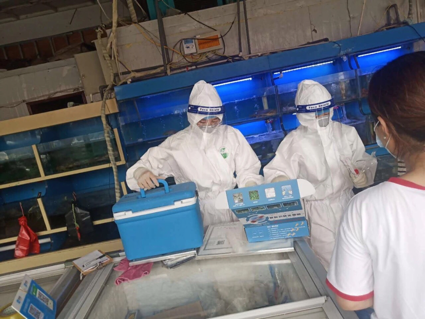 當(dāng)日,分別對(duì)6月14日排查中發(fā)現(xiàn)的一箱三文魚、銷售三文魚的電子秤、分割案板等相關(guān)器具進(jìn)行了核酸檢測(cè),隨后又對(duì)周邊經(jīng)營(yíng)進(jìn)口凍品的人員及相關(guān)產(chǎn)品也進(jìn)行抽樣檢測(cè)。抽樣完畢后,市場(chǎng)監(jiān)管分局執(zhí)法人員繼續(xù)對(duì)市場(chǎng)內(nèi)的水產(chǎn)品批發(fā)經(jīng)營(yíng)區(qū)進(jìn)行檢查,查看商戶的相關(guān)資質(zhì)和經(jīng)營(yíng)環(huán)境,檢查了海鮮類產(chǎn)品的進(jìn)貨渠道及相關(guān)檢疫證明等,共計(jì)檢查海鮮商戶5戶、凍品商戶7戶、水產(chǎn)區(qū)商戶8戶,未發(fā)現(xiàn)由北京新發(fā)地市場(chǎng)進(jìn)口的三文魚類海鮮產(chǎn)品及國(guó)外重點(diǎn)疫區(qū)進(jìn)出口水產(chǎn)品。