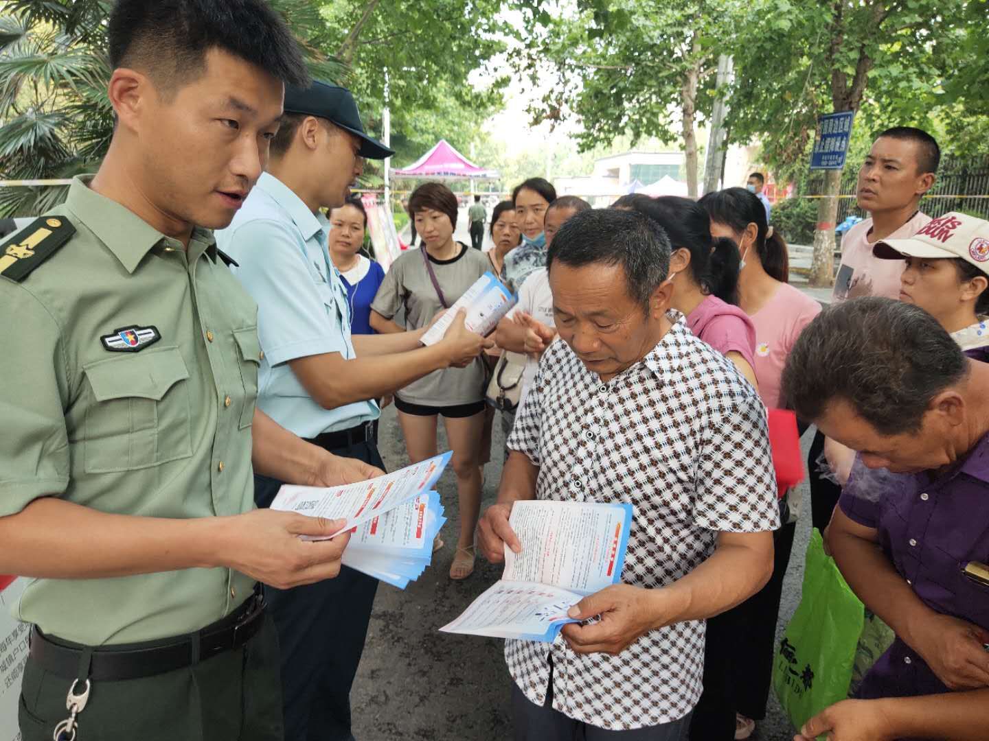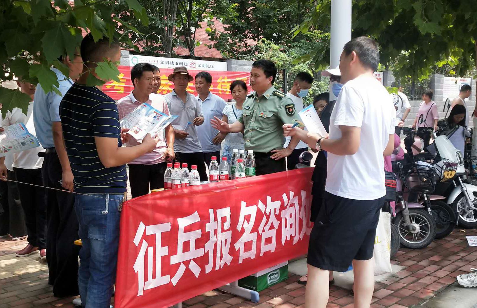 為強(qiáng)化全民依法履行兵役義務(wù)觀(guān)念,激發(fā)廣大適齡青年特別是高學(xué)歷青年參軍入伍熱情,7月7日至8日,項(xiàng)城市人武部組織機(jī)關(guān)所有人員和21個(gè)鎮(zhèn)(街道)辦事處武裝部長(zhǎng)等36人,深入各考點(diǎn)設(shè)立征兵政策咨詢(xún)點(diǎn),懸掛宣傳標(biāo)語(yǔ)、擺放宣傳版面,開(kāi)展以助力高考為目的的大學(xué)生征兵宣傳活動(dòng)。為不影響考場(chǎng)秩序避免打擾高考,7月7日全天,參加宣傳的工作人員悄悄走進(jìn)家長(zhǎng)等待區(qū),現(xiàn)場(chǎng)向廣大考生家長(zhǎng)以及過(guò)往群眾發(fā)放《應(yīng)征入伍明白卡》、《大學(xué)生入伍優(yōu)惠政策》等征兵宣傳資料,并接受咨詢(xún)。7月8日下午5點(diǎn)30分后,為期兩天的高考結(jié)束后考生放松的走出考場(chǎng)大門(mén)之際,所有人員同時(shí)守在大門(mén)外,一邊給考生發(fā)放宣傳資料,一邊接受學(xué)生咨詢(xún)和報(bào)名,給他們講解大學(xué)生入伍政策、法規(guī),介紹“應(yīng)征入伍的政治、文化、身體和年齡條件”、“報(bào)名程序”、“就業(yè)安置”等相關(guān)內(nèi)容,鼓勵(lì)高中畢業(yè)生帶著成績(jī)和文化知識(shí)投身軍營(yíng)、報(bào)效祖國(guó)。