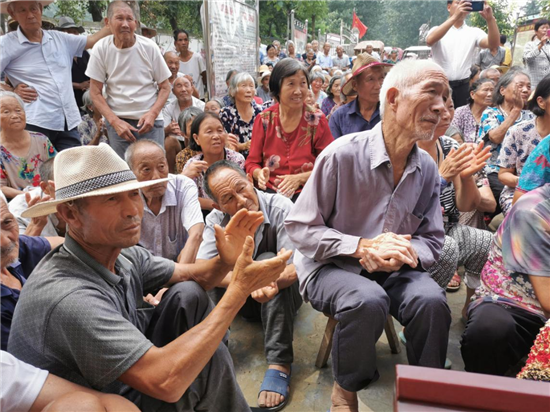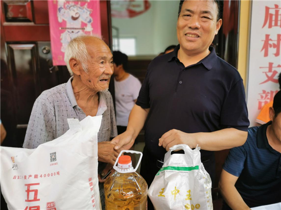 發(fā)放儀式開始后,村干部負責發(fā)放,老人們有序領(lǐng)取,個個興高采烈,歡笑聲響徹在邵廟村的上空……