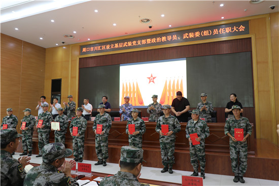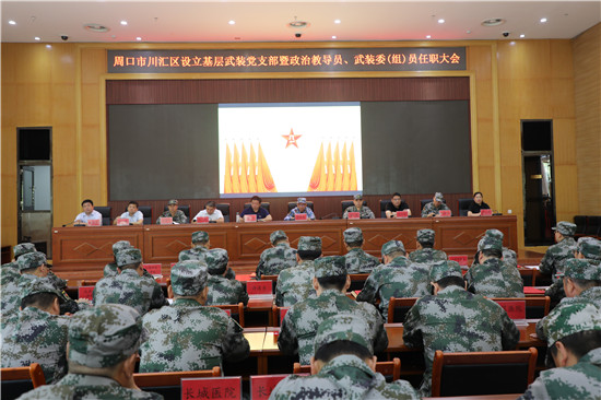 黨管武裝建設國防,軍民攜手共筑長城。為健全武裝工作組織領導體系為推動國防動員和后備力量建設在基層末端落實,7月16日上午,周口市川匯區(qū)召開基層武裝黨支部暨政治教導員、武裝委(組)員任職大會。周口軍分區(qū)司令員湯維政,區(qū)委書記、區(qū)人武部黨委第一書記李宗喜,周口軍分區(qū)政治工作處主任李揚,市委組織部副處級調(diào)研員宋陽,區(qū)人武部政委高新傳、部長陳繼芳及城鄉(xiāng)一體化示示范區(qū)、經(jīng)濟開發(fā)區(qū)、港口物流產(chǎn)業(yè)聚集區(qū)等有關負責同志參加了大會。會上設立了18個基層武裝黨支部,任命了15名基層武裝部政治教導員、20名村(社區(qū))武裝委(組)員任職命令,武裝部政治教導員、武裝預建黨支部書記和兼職武裝委(組)員代表先后作了履職承諾發(fā)言,湯維政等為新任命的人員頒發(fā)了任職證書。
