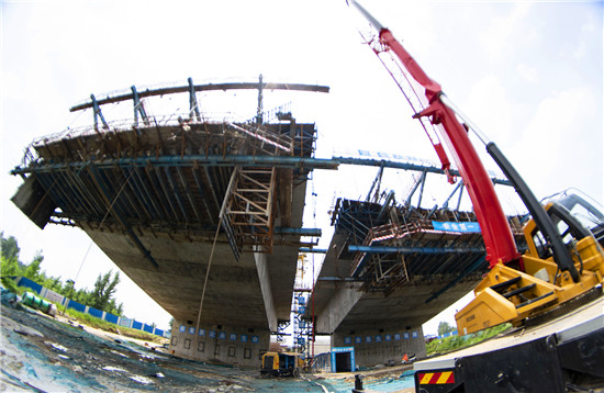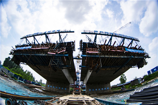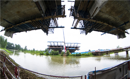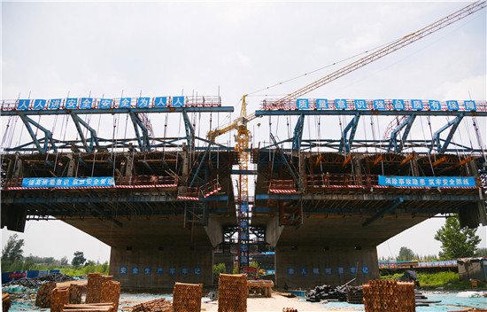 周口北環(huán)跨賈魯河大橋是我市在建重點(diǎn)工程,全長(zhǎng)904米,其中主橋總長(zhǎng)286米,共3跨,采用懸澆法施工。7月16日中午,記者在工地看到,經(jīng)過一年多的施工,工程完成80%左右,為了保障工期和質(zhì)量,工人們冒著酷暑,在跨河的兩列橋墩上,忙碌著澆鑄施工,隨著澆鑄橋體的延伸,預(yù)計(jì)年底橋體完成合攏。