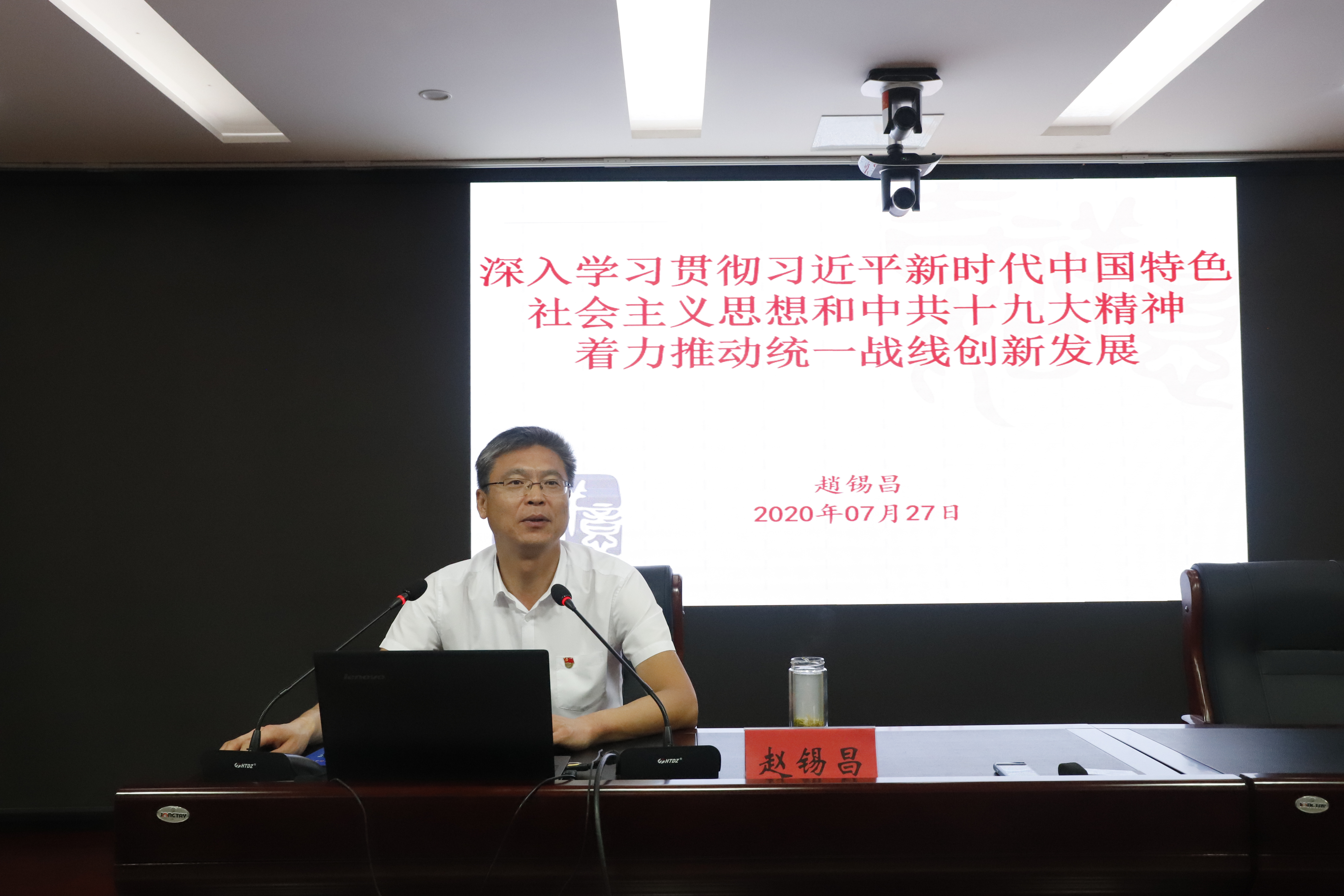 趙錫昌以《深入學(xué)習(xí)貫徹習(xí)近平新時代中國特色社會主義思想和中共十九大精神著力推動統(tǒng)一戰(zhàn)線創(chuàng)新發(fā)展》為題,圍繞新時代統(tǒng)一戰(zhàn)線的定位、新時代統(tǒng)一戰(zhàn)線的要求、新時代統(tǒng)一戰(zhàn)線的任務(wù)、新時代統(tǒng)戰(zhàn)工作的方法等四個方面,就統(tǒng)一戰(zhàn)線的性質(zhì)、主題、功能、方針、工作方法、對象范圍和中央對統(tǒng)戰(zhàn)工作的要求等重點內(nèi)容,為參訓(xùn)黨員干部了一堂生動的理論知識輔導(dǎo)課。
