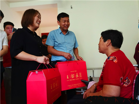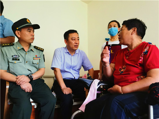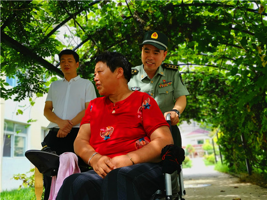 走進位于太昊路上的周口市老年護理院,院內整潔有序、花蕊吐香鳥鳴聲聲,小徑通幽處的涼亭內三五老人打牌、聊天,一副愜意安詳?shù)纳顖鼍啊T诤顕I母親王玉勤居住的房間內,李揚、孫光濤等人坐在床邊與她聊天談心,看到這么多人來慰問她,王玉勤眼中流下了感動的眼淚,她對慰問人員表示感謝,說自己來護理院近一年來,吃住條件都不錯,護理院照顧的無微不至,身體一天天恢復,閑暇時還能不依賴輪椅自己走上一段路。她激動地說:“感謝黨和政府的親切關懷,我最大的愿望是希望倆兒子永遠聽黨的話,在部隊安心服役、再立新功,用優(yōu)異的成績回報黨和政府對我們全家的關愛。”