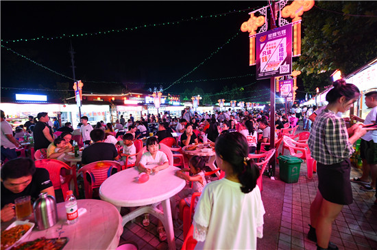 這里云集著全國各地的風味小吃,成為廣大市民休閑消暑的打卡地、網(wǎng)紅地,也成了附近居民創(chuàng)業(yè)、就業(yè)的基地。尤其是為推進“創(chuàng)衛(wèi)”工作,開發(fā)區(qū)對這個夜市進行高標準持續(xù)打造,努力提升廣場夜市的經(jīng)營條件和周邊環(huán)境,對各攤點的硬件設施規(guī)范提升。根據(jù)有關標準和管理需求,開發(fā)區(qū)協(xié)調(diào)有關部門,為夜市配備了治安民警、社區(qū)網(wǎng)格員、城管隊員、市場監(jiān)督員、衛(wèi)生監(jiān)督員、市場保潔員。城管部門根據(jù)實際情況,為南廣場規(guī)范停車場地,凈化外部環(huán)境,同時嚴格禁止超越夜市場所范圍經(jīng)營,不斷提升周邊環(huán)境。區(qū)市場監(jiān)督管理分局根據(jù)實際情況,對各家餐飲經(jīng)營攤點的員工進行統(tǒng)一培訓,協(xié)助辦理餐飲經(jīng)營許可證,同時要求所有工作人員持健康證上崗。根據(jù)餐飲業(yè)經(jīng)營規(guī)范的要求,區(qū)市場監(jiān)督管理分局對各攤點的內(nèi)部設施進行逐家驗收,嚴格把關,協(xié)助規(guī)范整改,從而形成了良好的餐飲衛(wèi)生環(huán)境。新冠肺炎疫情防控進入常態(tài)化階段以后,開發(fā)區(qū)敏銳地抓住契機,迅速推進復產(chǎn)復工,在做好疫情防控規(guī)范的同時,積極推進南廣場夜市恢復營業(yè)。3月17日,南廣場夜市恢復營業(yè)后,迅速形成火爆場景。