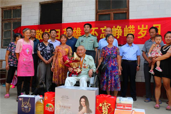 于永前一行來到楊廟鄉(xiāng)大祁行政村時(shí)已近中午,正趕上97歲抗日老戰(zhàn)士吳之太過生日。吳之太老少一家人歡聚一堂,其樂融融??吹轿繂柦M的到來,老人喜極而泣。吳之太老人擦著眼淚說:這些年沒少給黨和政府找麻煩,尤其是縣退役軍人事務(wù)局成立后,幫助他解決了好多困難和問題,并定期來看望他,今天又見到大家,真不知道該說什么好。潘布道代表退役軍人事務(wù)局向老人祝賀生日并告訴老人說:抗戰(zhàn)老戰(zhàn)士是民族的英雄、國(guó)家的財(cái)富,為黨的革命和建設(shè)作出了不可磨滅的貢獻(xiàn)。今后,將一如既往地關(guān)心和幫助抗戰(zhàn)老戰(zhàn)士,盡力幫助解決生活中的實(shí)際問題,在全社會(huì)形成尊重抗戰(zhàn)老戰(zhàn)士、尊崇抗戰(zhàn)老戰(zhàn)士、關(guān)愛抗戰(zhàn)老戰(zhàn)士的良好氛圍。