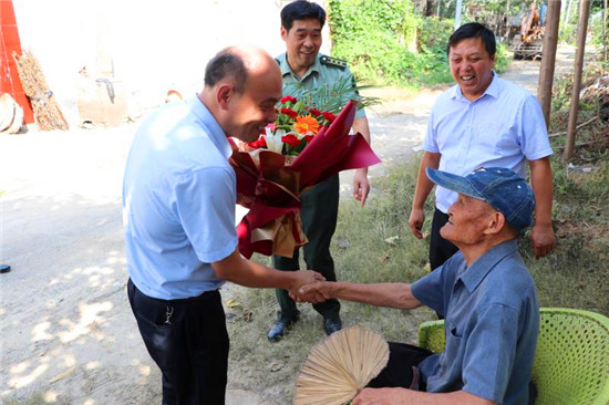 今年,是中國(guó)人民抗日戰(zhàn)爭(zhēng)暨世界反法西斯戰(zhàn)爭(zhēng)勝利75周年。太康縣委常委、縣人武部部長(zhǎng)于永前,縣退役軍人事務(wù)局黨組書記、局長(zhǎng)潘布道日前先后來到高賢、楊廟等鄉(xiāng)鎮(zhèn)走訪慰問抗日老戰(zhàn)士,開展“敬獻(xiàn)一束鮮花、表達(dá)一聲問候、送上一份禮品、備一個(gè)健康包、拍一張合影留念照片”“五個(gè)一”活動(dòng),把黨和政府的關(guān)懷溫暖送到老戰(zhàn)士的心坎上。