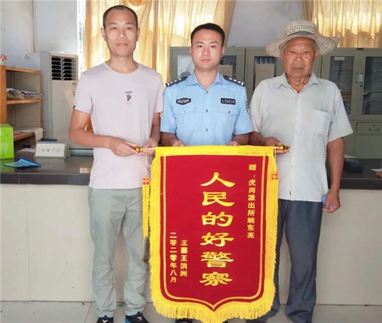 “沒想到,真沒想到,我這輩子還能與兒子相見,太感謝你了?!弊蛉眨惓强h虎崗鄉(xiāng)派出所戶籍室門口鞭炮齊鳴,該鄉(xiāng)王寨行政村75歲的貧困戶王洪周和兒子王鐵練及親屬向戶籍民警姚東亮送上錦旗后,感激之情溢于言表。