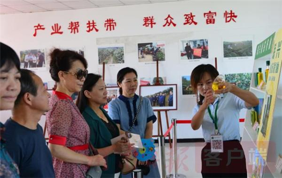 在光山縣槐店鄉(xiāng)司馬光油茶園的河南聯(lián)興油茶公司的展廳內(nèi),講解員正在給游客介紹油茶產(chǎn)品。劉宏冰 攝