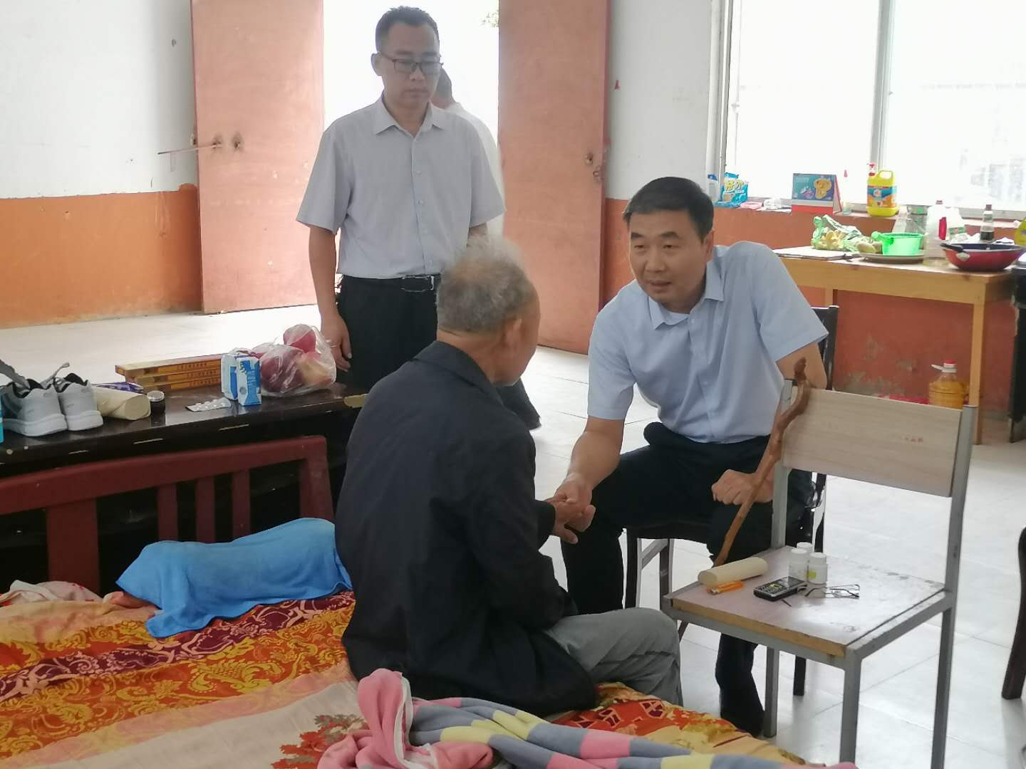 當(dāng)日16時(shí),在三李村村室旁邊的一間房屋內(nèi),孔陽一見到坐在床頭的張殿運(yùn),就緊緊拉住他的手,詳細(xì)詢問老人吃的什么藥、效果怎么樣、身體恢復(fù)得如何?他叮囑老人:“你保重好身體就是對兒子工作的支持,也是對商水縣扶貧工作的支持?!睆埖钸\(yùn)說話困難,表達(dá)不清,嘴唇顫抖半天也說不出一句話,只是緊緊地握住孔陽的手。得知老人在鹿邑縣宋河鎮(zhèn)農(nóng)村當(dāng)村干部30多年,孔陽稱贊他為黨為民工作一輩子,是好樣的。