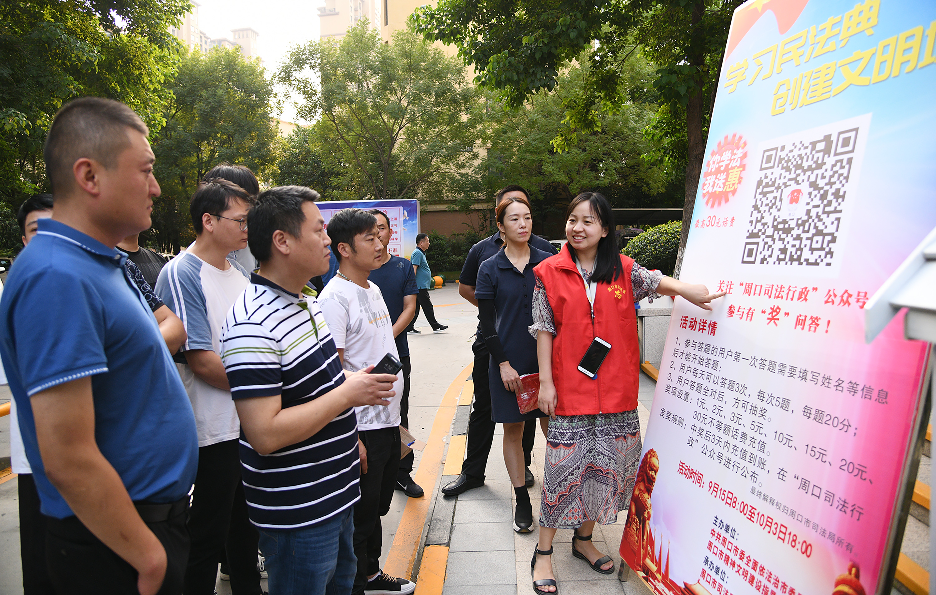 周口日?qǐng)?bào)·新周口客戶(hù)端 我國(guó)于今年5月份頒布的《民法典》是一部被譽(yù)為“社會(huì)生活的百科全書(shū)”的法律,涉及民生諸多方面。近日,市司法部門(mén)深入社區(qū),以學(xué)法有獎(jiǎng)形式,宣傳這部和老百姓生活密切相關(guān)的法律。圖為市司法部門(mén)工作人員在建業(yè)森林半島社區(qū)宣傳。記者 梁照曾 攝