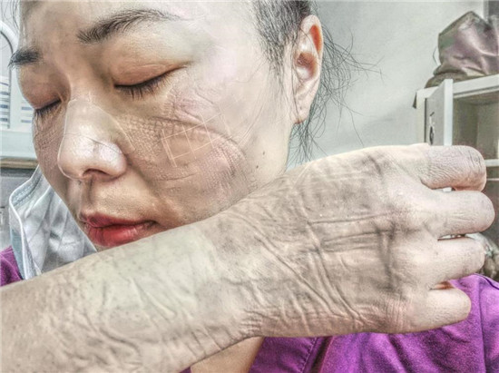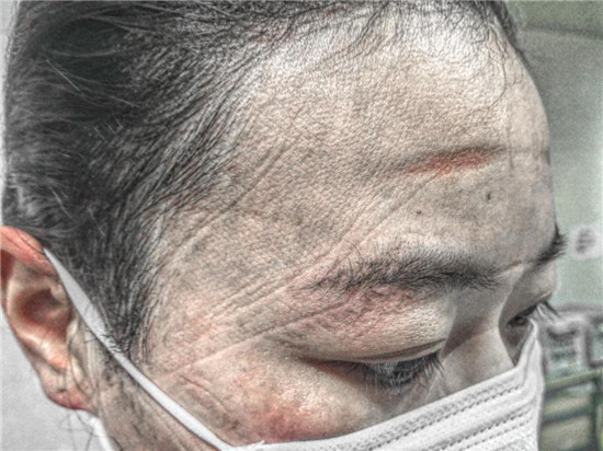 因?yàn)樾鹿诜窝椎膹?qiáng)傳染性,胡奔奔每次去病區(qū)上班都要全副武裝,而且為保證在6個小時的工作時間內(nèi)不被暴露,不能去衛(wèi)生間,不能喝水,還要穿上成人紙尿褲以防萬一。這樣下來,汗?jié)褚路浅J拢蚁掳嗪竺摰舴雷o(hù)裝備后,她原本清秀白皙的臉上,滿是深深的皺褶,久久難以恢復(fù),惹人心疼。給家人報(bào)平安時,胡奔奔甚至不敢視頻聊天,只能語音安慰家人。