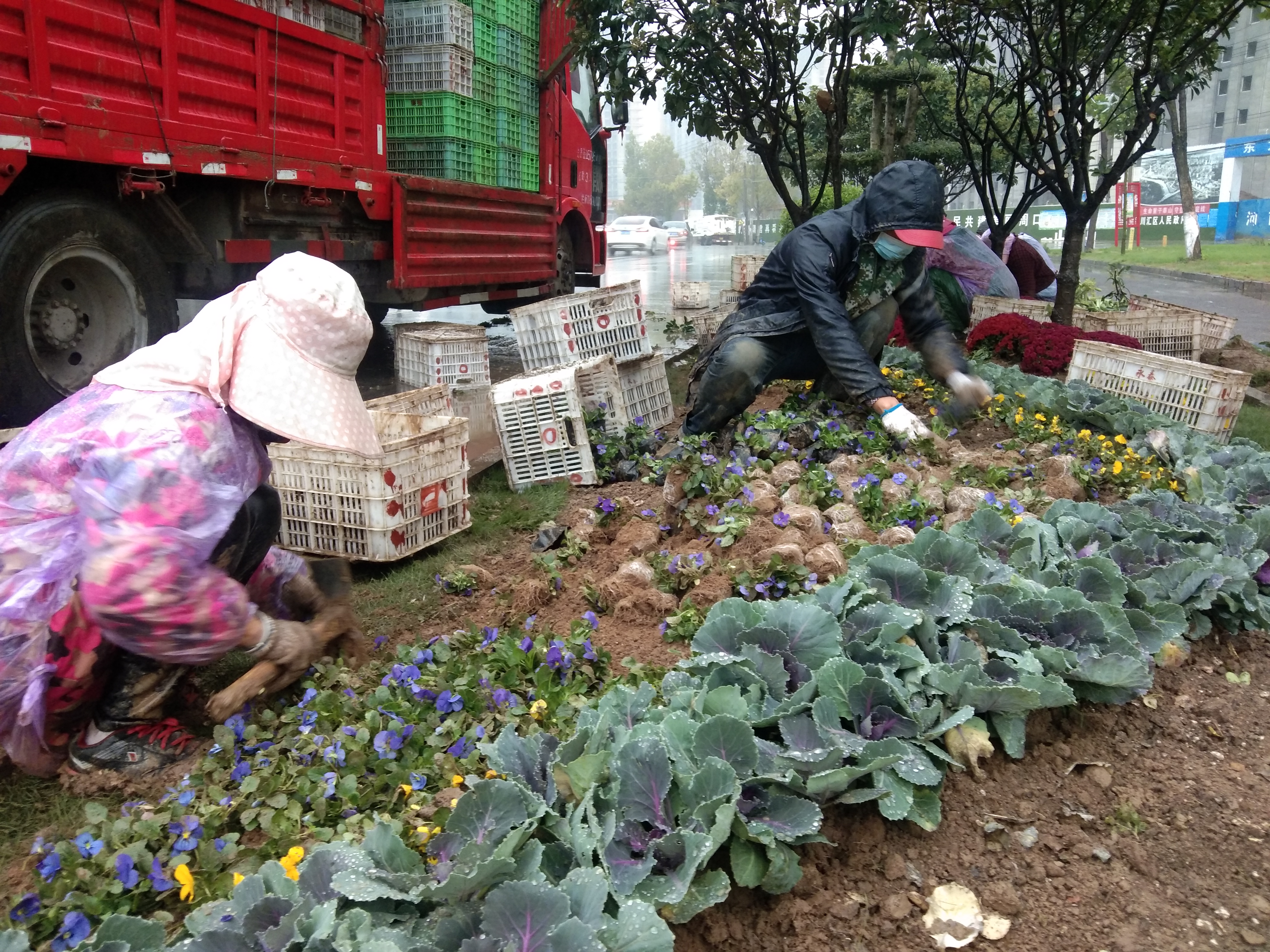 10月14日早晨,記者在周口中心城區(qū)七一路東段看到,幾名園藝工人正在道路邊的綠化帶內(nèi)栽種黃色、紫色的花兒。當(dāng)日,周口中心城區(qū)下起了淅淅瀝瀝的小雨,可是園藝工人卻全然不顧這些,抓住有利時(shí)機(jī)栽種花木,提高存活率,助力“創(chuàng)文”。記者 張洪濤 攝