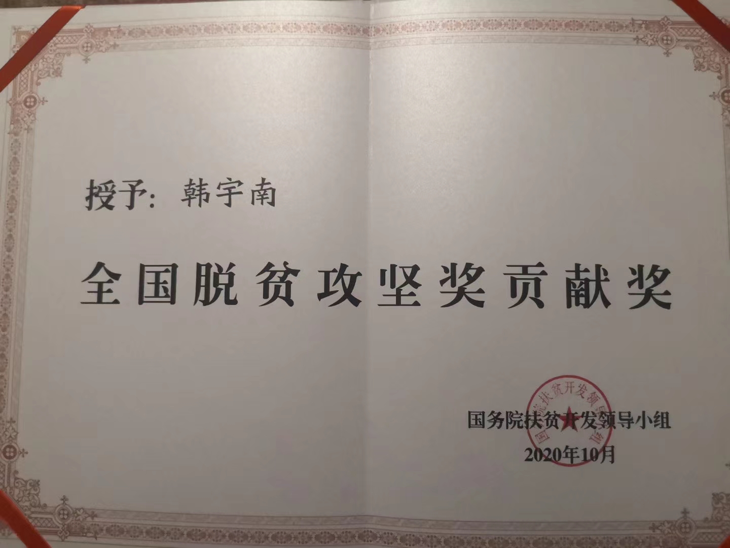 10月17日,2020年全國(guó)脫貧攻堅(jiān)獎(jiǎng)表彰大會(huì)暨首場(chǎng)脫貧攻堅(jiān)先進(jìn)事跡報(bào)告會(huì)在北京舉行。當(dāng)天,國(guó)務(wù)院扶貧開(kāi)發(fā)領(lǐng)導(dǎo)小組辦公室官網(wǎng)發(fā)布了關(guān)于表彰2020年全國(guó)脫貧攻堅(jiān)獎(jiǎng)的決定,太康縣馬廠鎮(zhèn)前何村第一書(shū)記韓宇南榮獲全國(guó)脫貧攻堅(jiān)貢獻(xiàn)獎(jiǎng)。