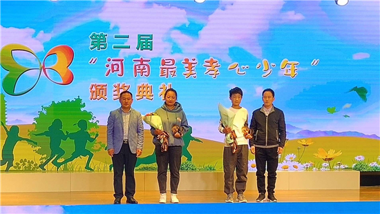 10月20日,河南省第二屆“河南最美孝心少年”頒獎典禮在河南省實驗學校鄭東小學舉行,全省表彰10名“河南最美孝心少年”,分別頒發(fā)獎杯、證書和1萬元獎勵。省教育廳副廳長毛杰等領導為孝心少年頒獎并合影留念。鄲城縣汲水二中學生薛勝楠光榮受獎。