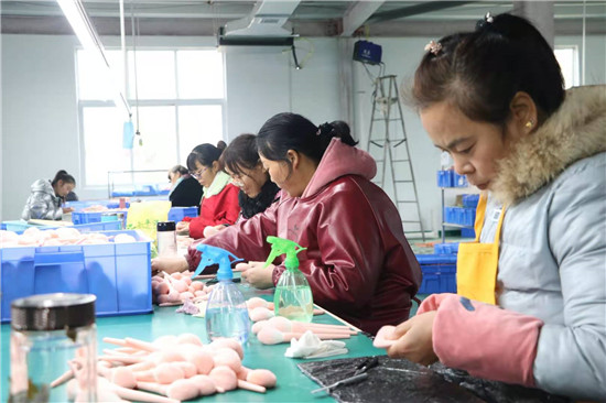 河南雅彩美妝用具有限公司負(fù)責(zé)人趙廣才介紹,公司主要從事化妝刷、美妝用具加工,十分適宜留守婦女干。車(chē)間里的工人基本都是貧困戶(hù)和住在附近的留守婦女。在家門(mén)口上班,既能掙錢(qián),又方便照顧家人。每天中午公司還提供午餐,工人早上來(lái)上班,下午下班不耽誤回家照看孩子?!拔疑习嘁呀?jīng)10多天了,再過(guò)不久,就可以領(lǐng)工資了,真是高興!”68歲的村民張美榮告訴記者,家里孩子們都大了,自己在家閑著也沒(méi)啥事,她就到包裝車(chē)間上班,一個(gè)月算下來(lái)能掙2000多元,活也不重,既鍛煉了身體,又提高了家庭收入。