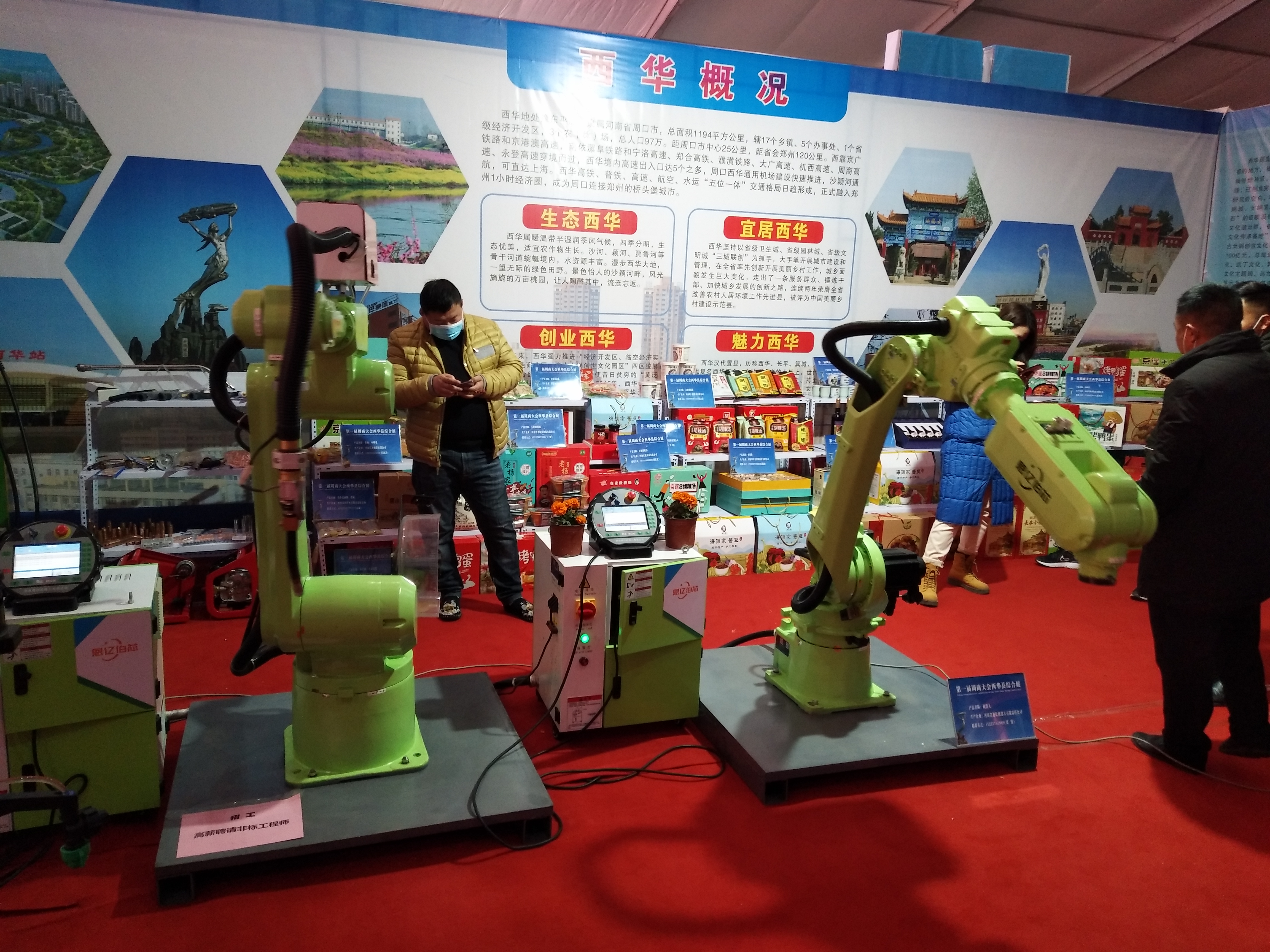 在西華縣展位,兩個(gè)高約1.5米、通體綠色的機(jī)械手臂,向來參觀的市民揮舞著“手掌”。這兩個(gè)機(jī)械手臂來自河南省恩億伯芯機(jī)器人有限公司,系西華縣本土企業(yè)自主研發(fā)。據(jù)董事長劉濤介紹,展示的機(jī)械手臂里,帶防撞器的是焊接汽車等大型機(jī)械用的,另一個(gè)是碼垛搬運(yùn)用的,一次能搬運(yùn)20公斤重的貨物。該廠成立于2014年,與宇通、東風(fēng)日產(chǎn)等大型廠商有深度合作,所研發(fā)的工業(yè)機(jī)器人在大理和天津等地均有運(yùn)用。圍觀市民表示,若不是此次周商產(chǎn)品展示展覽會,還真不知道周口有這些高科技企業(yè),希望周商的科技力量讓更多人看到。②8