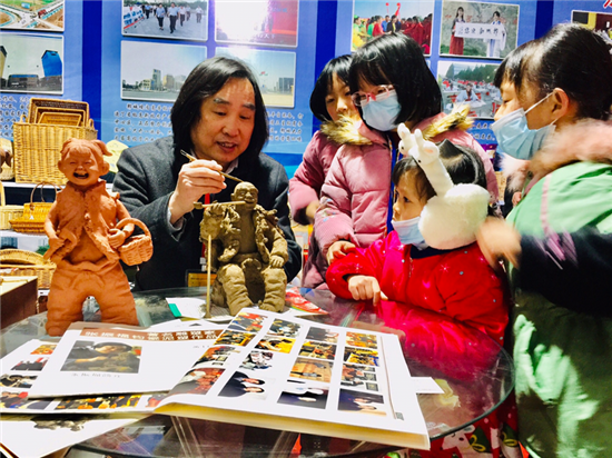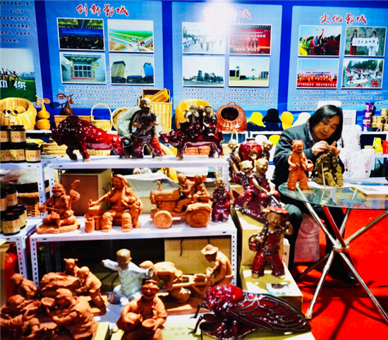 鄲城縣泥塑藝術(shù)大師張振福應邀攜48件作品參加大會,成為展會的一大亮點。其中原生態(tài)泥塑作品18件,有《磨豆汁》《耕耘》《酒逢知己》《二胡曲》等,鈞瓷泥塑作品20件,有《大金蟬》《年年有余》《豫東娃》《瑞牛迎春》等。張振福的作品表現(xiàn)豫東的鄉(xiāng)村人物,作品突出個性,憨態(tài)可掬,深受觀眾的喜愛,大家紛紛駐足觀看。