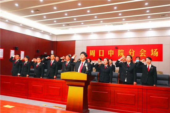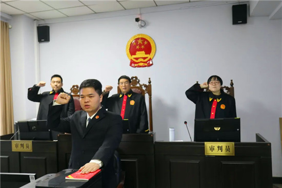 年末歲尾,在各審判庭一線工作忙碌的各辦案團(tuán)隊,同樣右手舉拳,莊嚴(yán)誦讀誓詞。