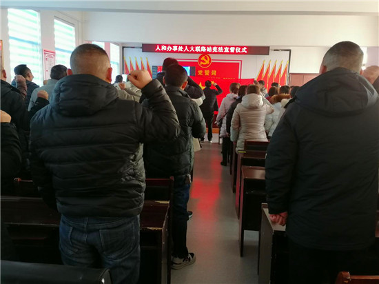 人和街道辦事處人大工委主任韓鈞右手舉拳,領(lǐng)誦誓詞,全體宣誓人肅立,面向國(guó)旗莊嚴(yán)宣誓。