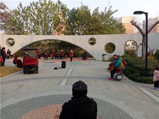 12月10日,雖然氣溫不高,可是天空暖陽高照,在周口中心城區(qū)建安路上的一個街頭游園內,不僅聚集了前來休閑的老人,還有不少戲迷朋友,她們手拿話筒,唱起戲曲節(jié)目,讓人樂在其中。記者 張洪濤 攝