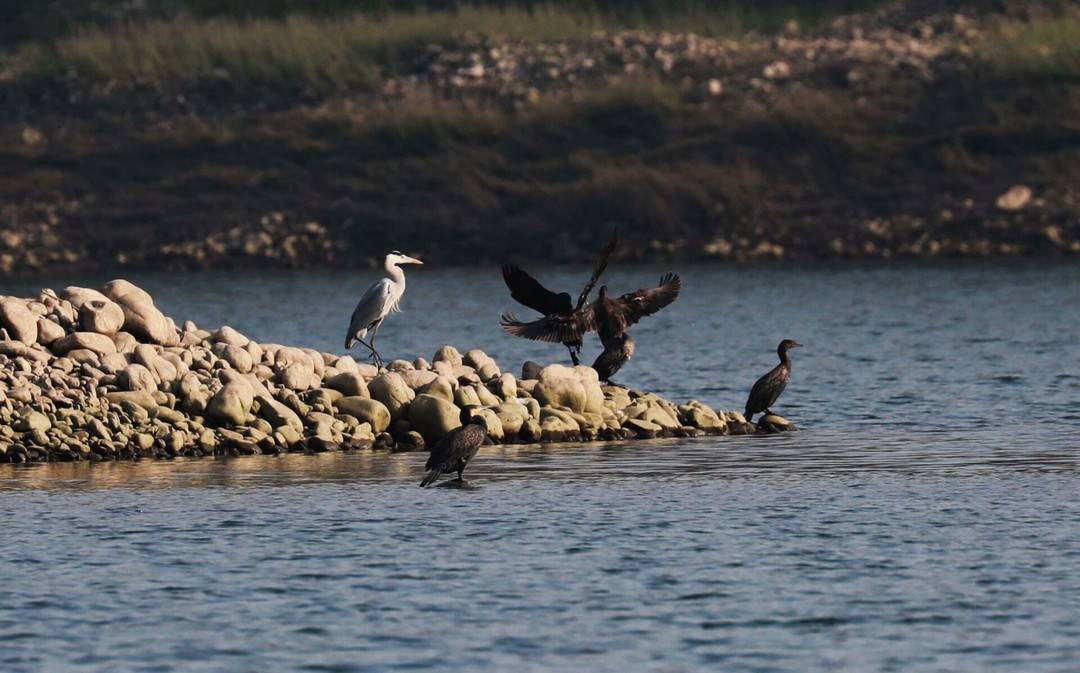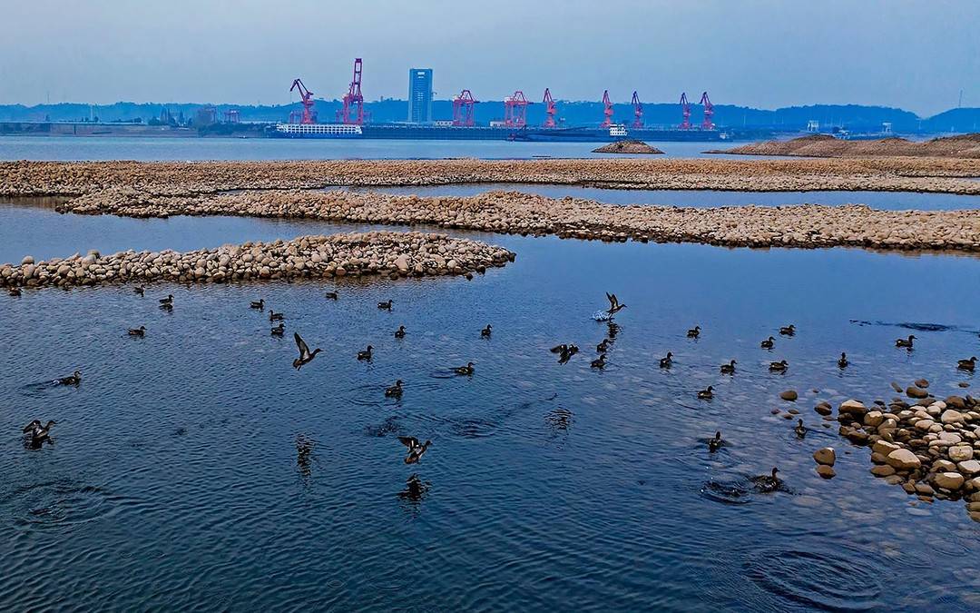 枯水期長江宜都段灘涂成鳥類樂園。
