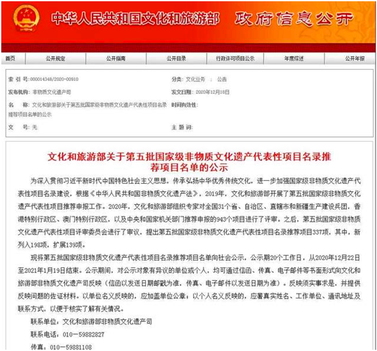 據(jù)了解,2019年,文化和旅游部開展了第五批國家級非物質(zhì)文化遺產(chǎn)代表性項目推薦申報工作。2020年,文化和旅游部組織專家對全國31個省、自治區(qū)、直轄市和新疆生產(chǎn)建設(shè)兵團(tuán),香港特別行政區(qū)、澳門特別行政區(qū),以及中央和國家機(jī)關(guān)部門推薦申報的943個項目進(jìn)行了評審。之后,第五批國家級非物質(zhì)文化遺產(chǎn)代表性項目評審委員會進(jìn)行了審議,提出第五批國家級非物質(zhì)文化遺產(chǎn)代表性項目名錄推薦項目337項,其中,新列入198項,擴(kuò)展139項。